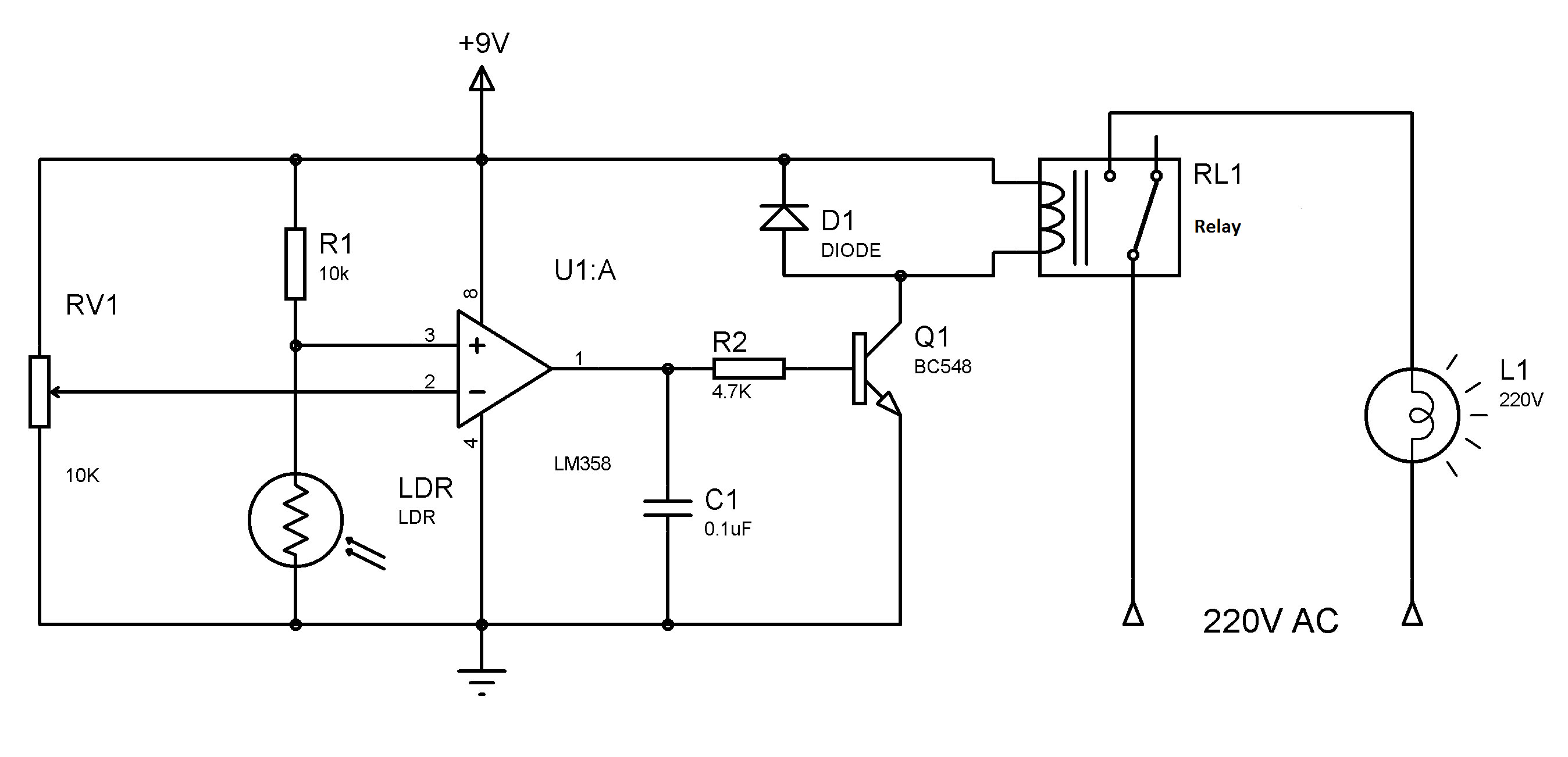 Pada rangkaian pengendali lampu taman otomatis ini IC LM358 bekerja sebagai komparator. Transistor BC548 berfungsi sebagai saklar untuk menyalakan relay. Potensiometer 10K digunakan untuk mengatur sensitivitas rangkaian. Ketika kegelapan terjadi di bawah tingkat tertentu (tingkat ini dapat dikontrol dengan memvariasikan potensiometer 1oK) tegangan di pin 3 (LDR) akan menjadi lebih besar dari tegangan di pin 2 (ditetapkan oleh potensiometer 10K) dan output komparator naik. Hal ini menyebabkan transistor menyala/aktif dan relay terhubung. Anda dapat menghubungkan semua jenis atau jumlah lampu. Anda harus memilih relay yang sesuai dengan nilai arus lampu.