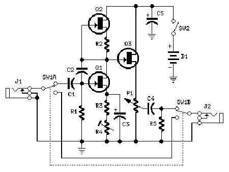 membuat efek fuzz. Di bawah ini kami sajikan gambar skema Rangkaian Efek Fuzz. Rangkaian ini bisa Anda kemas dalam sebuah kotak atau box.