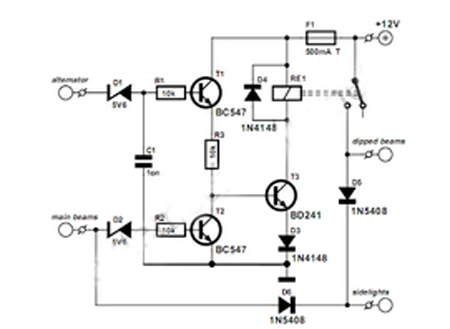 Rangkaian Lampu Mobil Otomatis ini memastikan bahwa Anda tidak akan pernah lagi lupa untuk mengaktifkan lampu mobil Anda. Segera setelah mesin berjalan, balok dicelup maka lampu samping secara otomatis diaktifkan. Rangkaian ini juga menyebabkan balok yang dicelupkan dapat dipadamkan sesegera ketika balok utama diaktifkan. Seperti yang dapat Anda lihat pada gambar skema, tidak ada komponen khusus yang diperlukan. Ketika mesin sedang berjalan, alternator akan menghasilkan tegangan lebih dari 14 V. Dioda D1 mengurangi tegangan ini sebesar 5,6 V dan lolos ke basis T1 melalui R1. Karena arus yang dihasilkan, T1 bekerja. Diperkuat arus mengalir melalui R3, basis T3 dan D3 ke tanah. Hal ini menyebabkan T3 juga bekerja dan memberi energi relay Re1.
